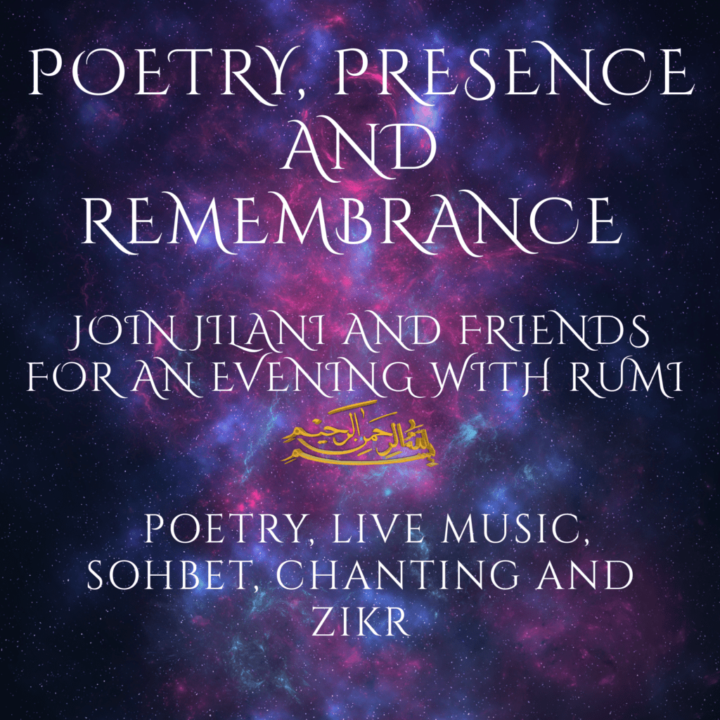 Jilani will share readings of Rumi’s mystical poetry, accompanied by beautiful live music, on guitar, viola and percussion. There will be times of Sohbet, or Sufi teaching through soulful conversation. Jilani will also lead the group in chanting Zikr and other sacred phrases in Arabic from the Sufi tradition.