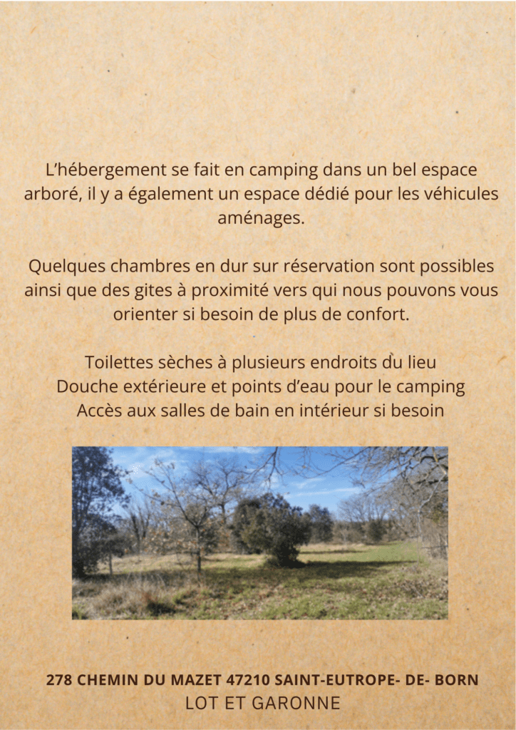 We have various sheltered spaces for workshops, lovely compost loos (including a new accessible compost toilet) and a mains water supply for drinking, hand washing, cooking, showering and bathing. We will maintain an open fire which marks the centre of our camping circle.