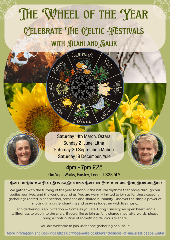 We gather with the turning of the year to honour the natural rhythms that move through our bodies, our lives, and the world around us. You are warmly invited to join u s for these seasonal gatherings rooted in connection, presence and shared humanity. Discover the simple power of moving in a circle, chanting and praying together with live music.